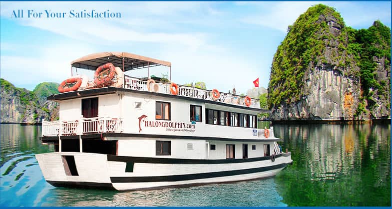 13h45: Sau khi thưởng thức bữa trưa, du khách có thể đứng trên boong tàu để chụp ảnh, ngắm nhìn vịnh hạ long. Điểm đầu tiên du khách được thăm quan chính là hòn Chó Đá đứng sừng sững quay lưng ra biển.